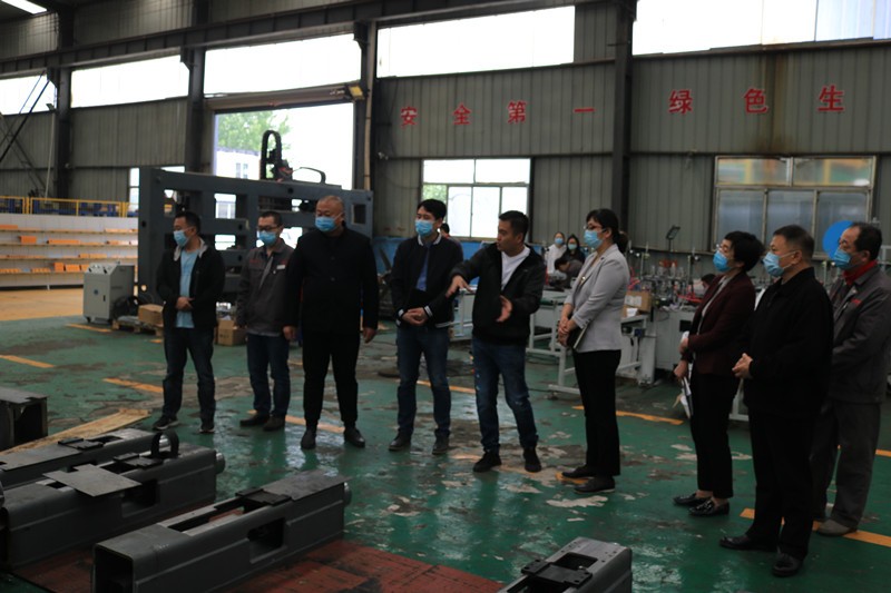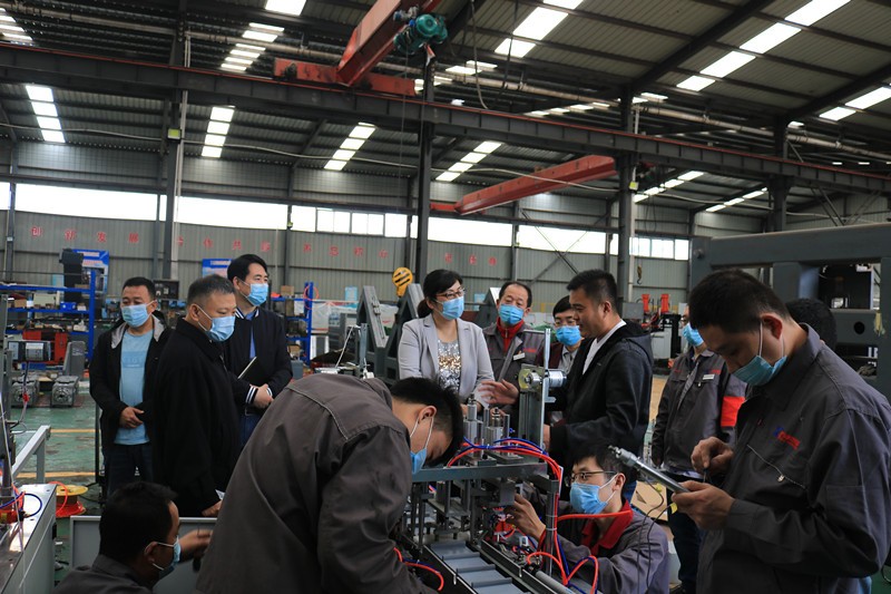 逯明書記一行首先來到了生產車間,現場考察企業在常態化疫情防控下的復工復產情況和面臨的困難。在裝配調試區,逯書記詳細了解了一拖二全自動口罩機、高速數控角鋼鉆孔生產線、新型高速數控角鋼沖孔打字剪切生產線等設備的裝配調試情況和生產過程中遇到的困難。